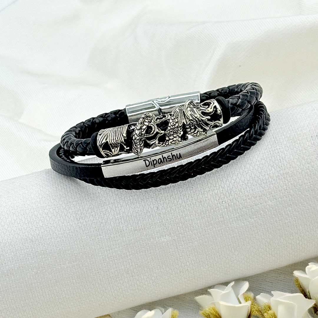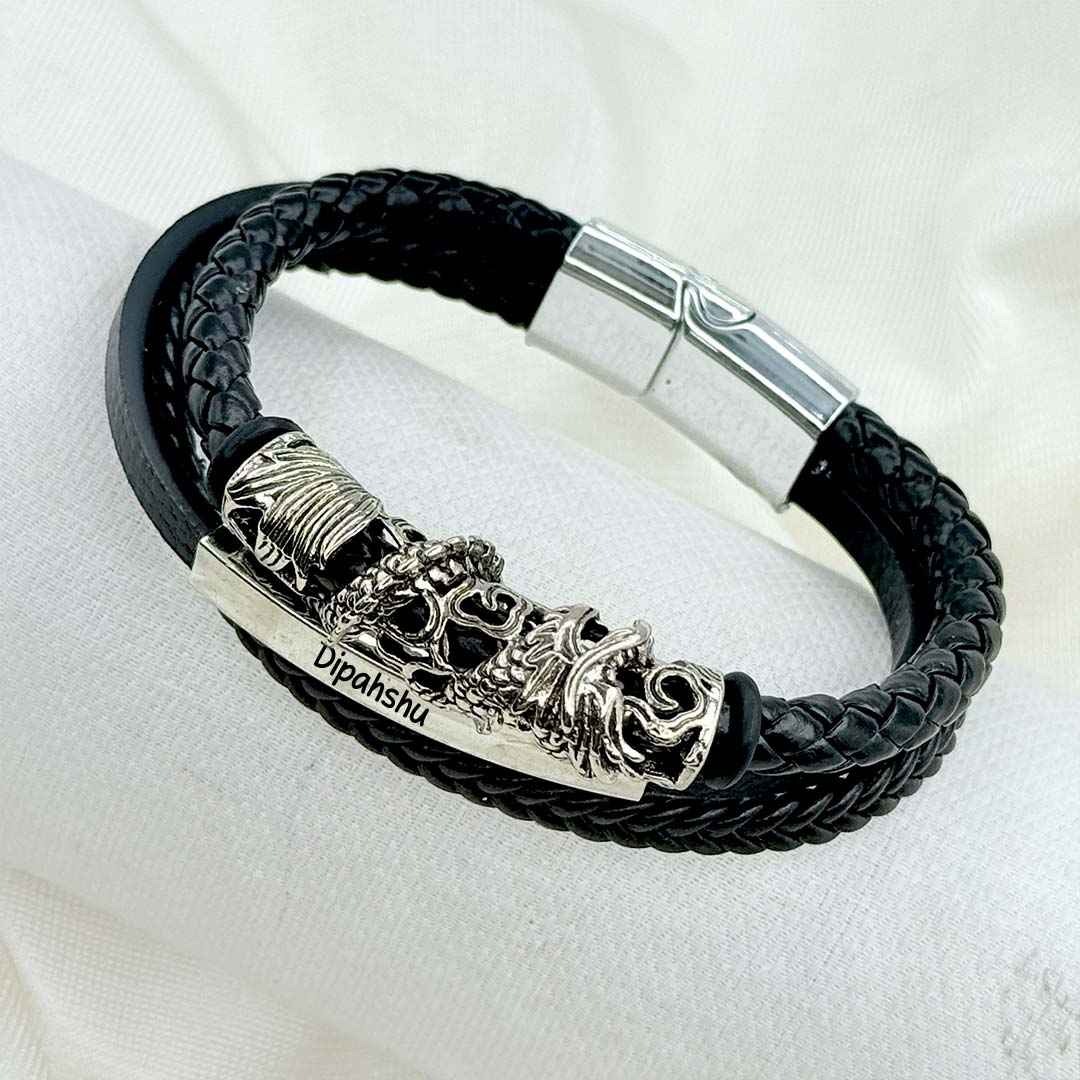 Unleash your inner warrior with our Personalized Dragon Charm Bracelet – a striking combination of braided black leather, detailed dragon metalwork, and your custom name engraving. This bracelet blends bold design with personalization, making it a must-have accessory for men who like to stand out.
