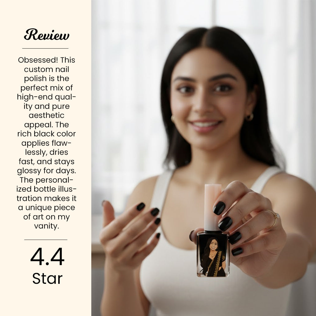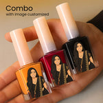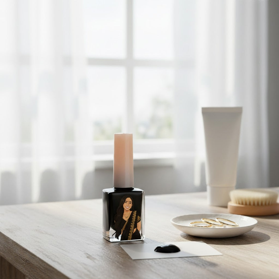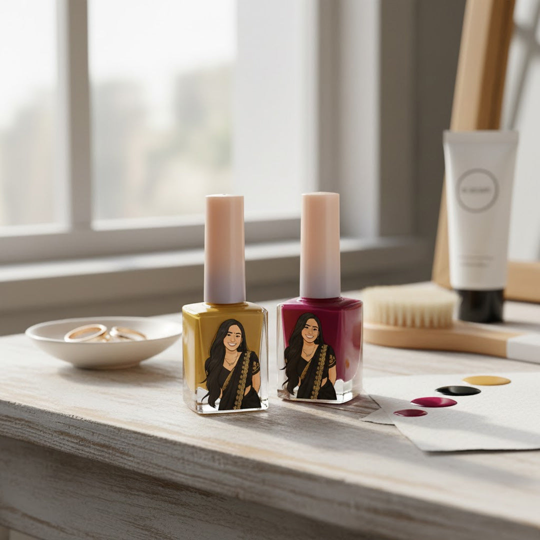 Hey beautiful! Here’s something truly unique — a 3-piece personalized nail polish combo featuring a cute custom illustrated portrait of you (or anyone you choose) on each bottle.