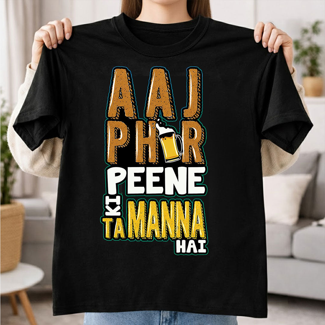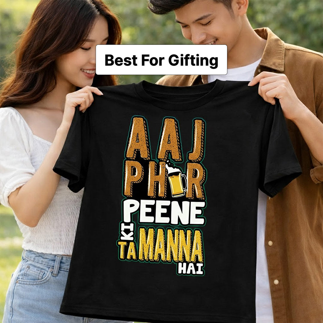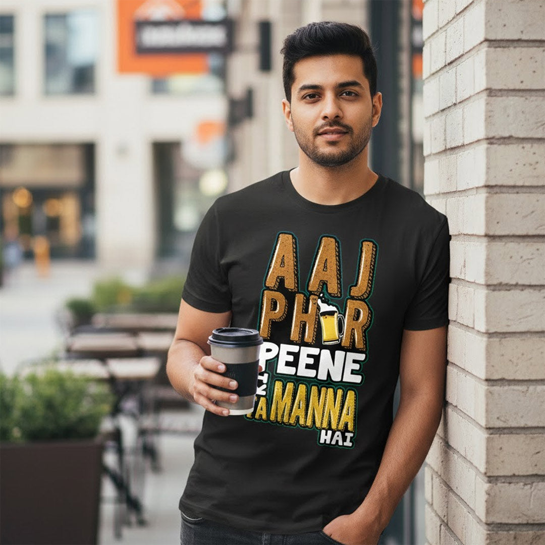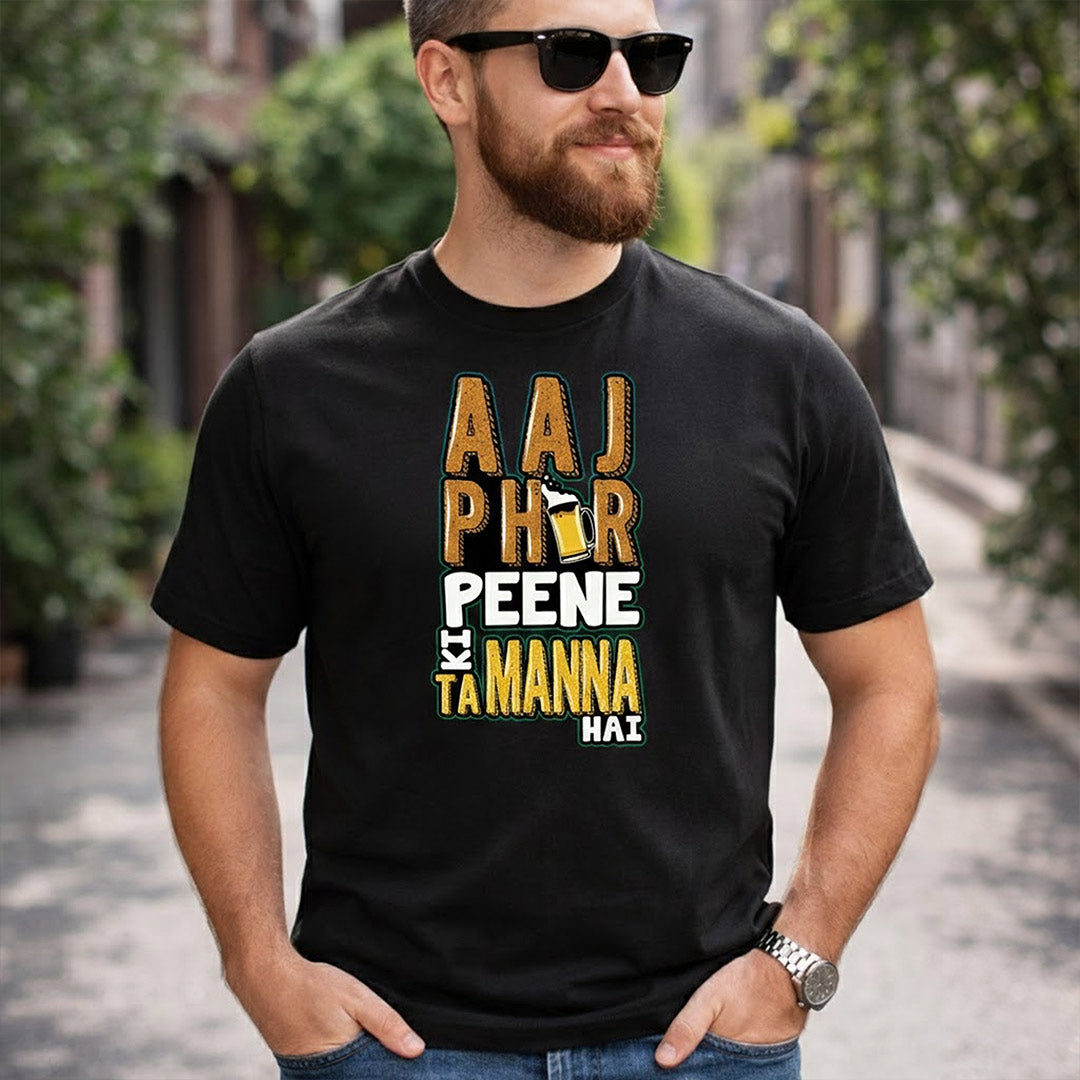 The Aaj Phir Peene Ki Tammanah Hai Printed T-Shirt is designed for those who enjoy fun quotes and confident casual fashion. The bold typography print stands out sharply on a classic black base, giving the t-shirt a trendy and expressive look.