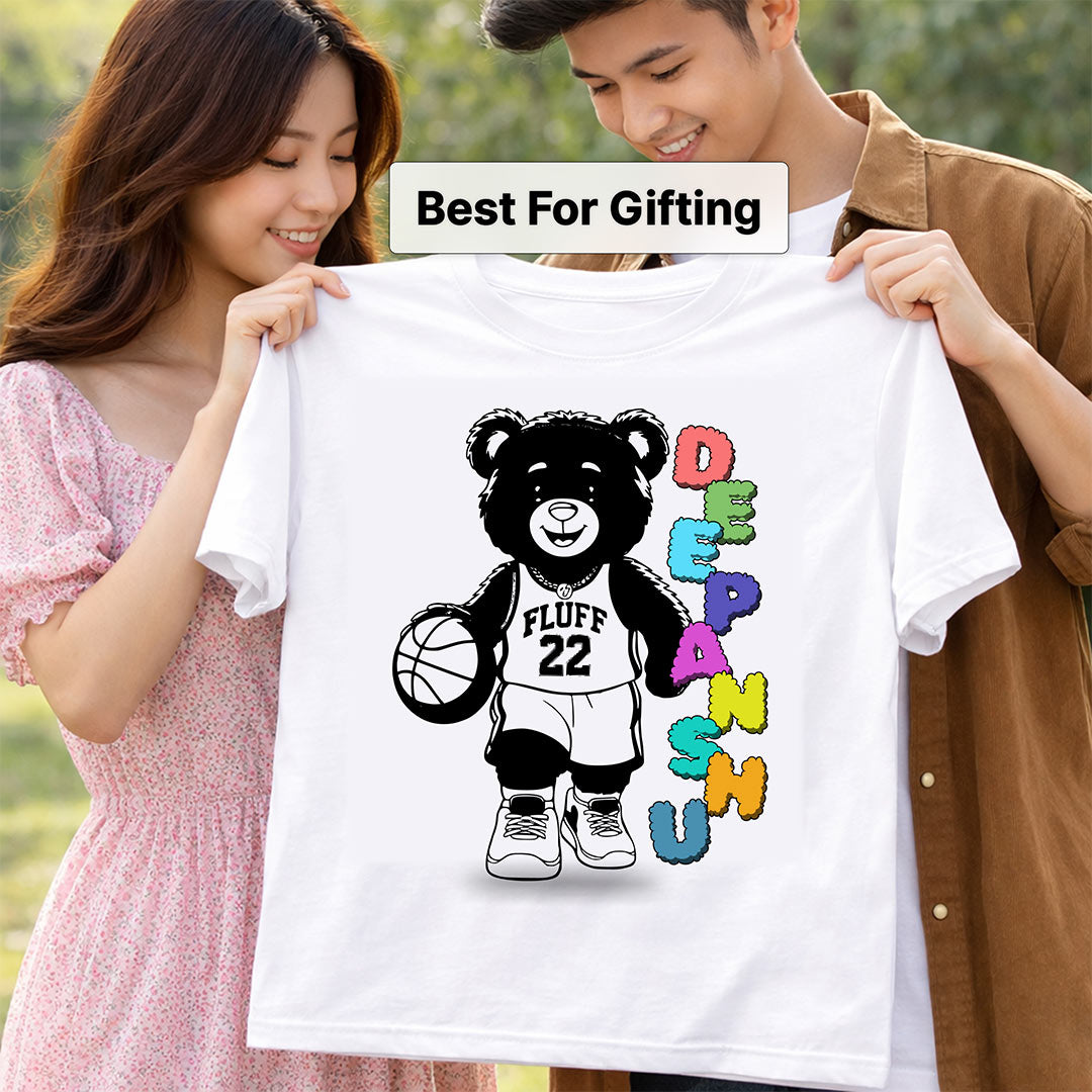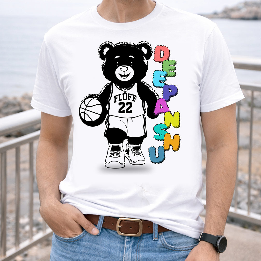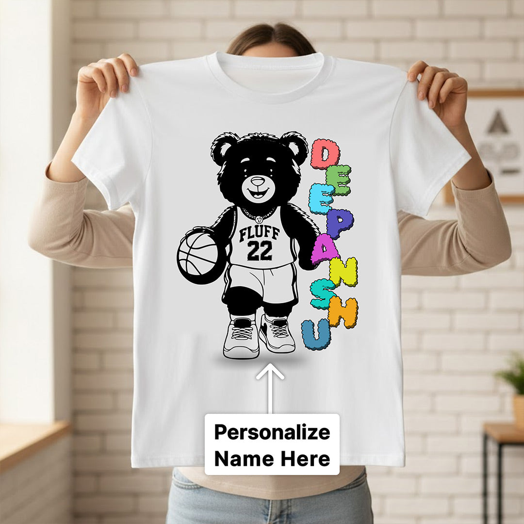 The Personalized Basketball Bear Name T-Shirt features a cool urban bear wearing a “Fluff 22” jersey, holding a basketball with colorful vertical typography design. It’s edgy, stylish, and perfect for teens, men, and women who love sporty street fashion.