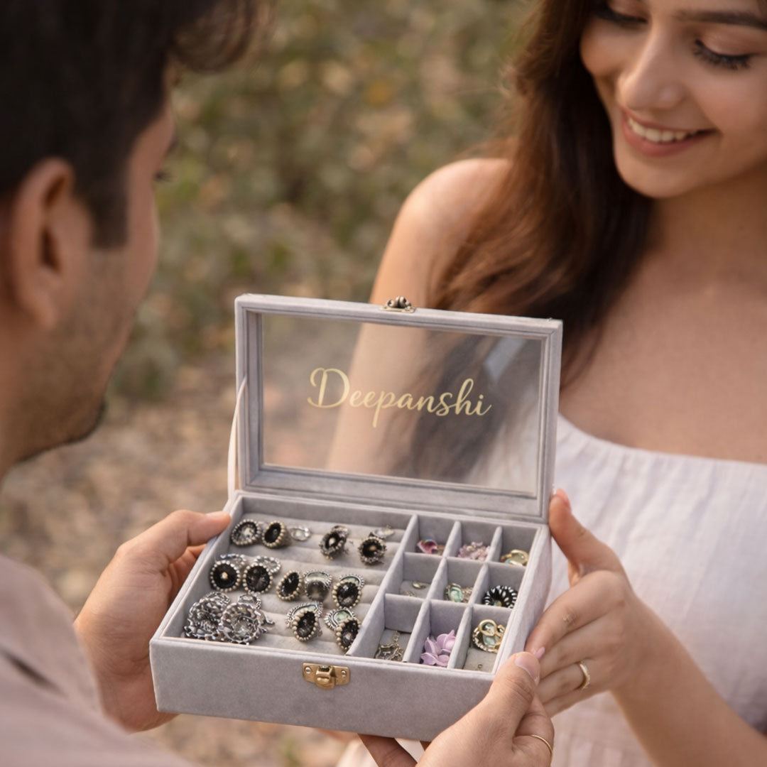 Luxury velvet organizer with engraved name — includes complimentary jewellery as per availability.