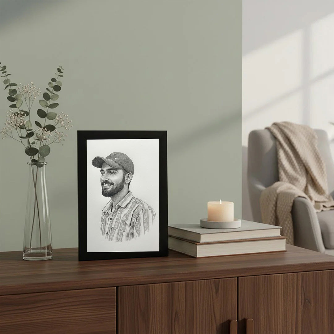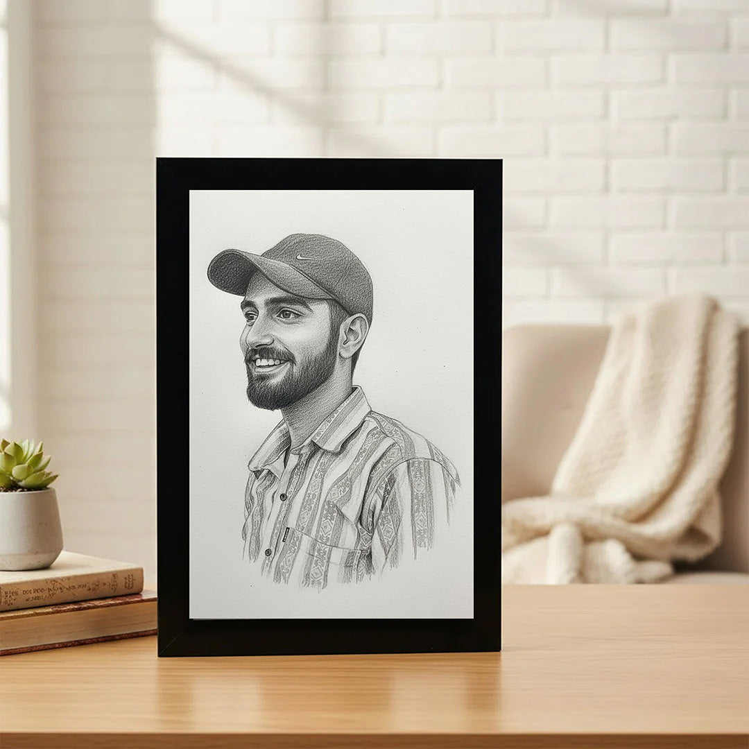 This Personalized Pencil Sketch Portrait Wall Frame transforms your photo into a realistic black-and-white pencil sketch, giving it a classic, elegant look. Perfect for homes, offices, and gifting, this artwork adds a premium and emotional touch to any space.