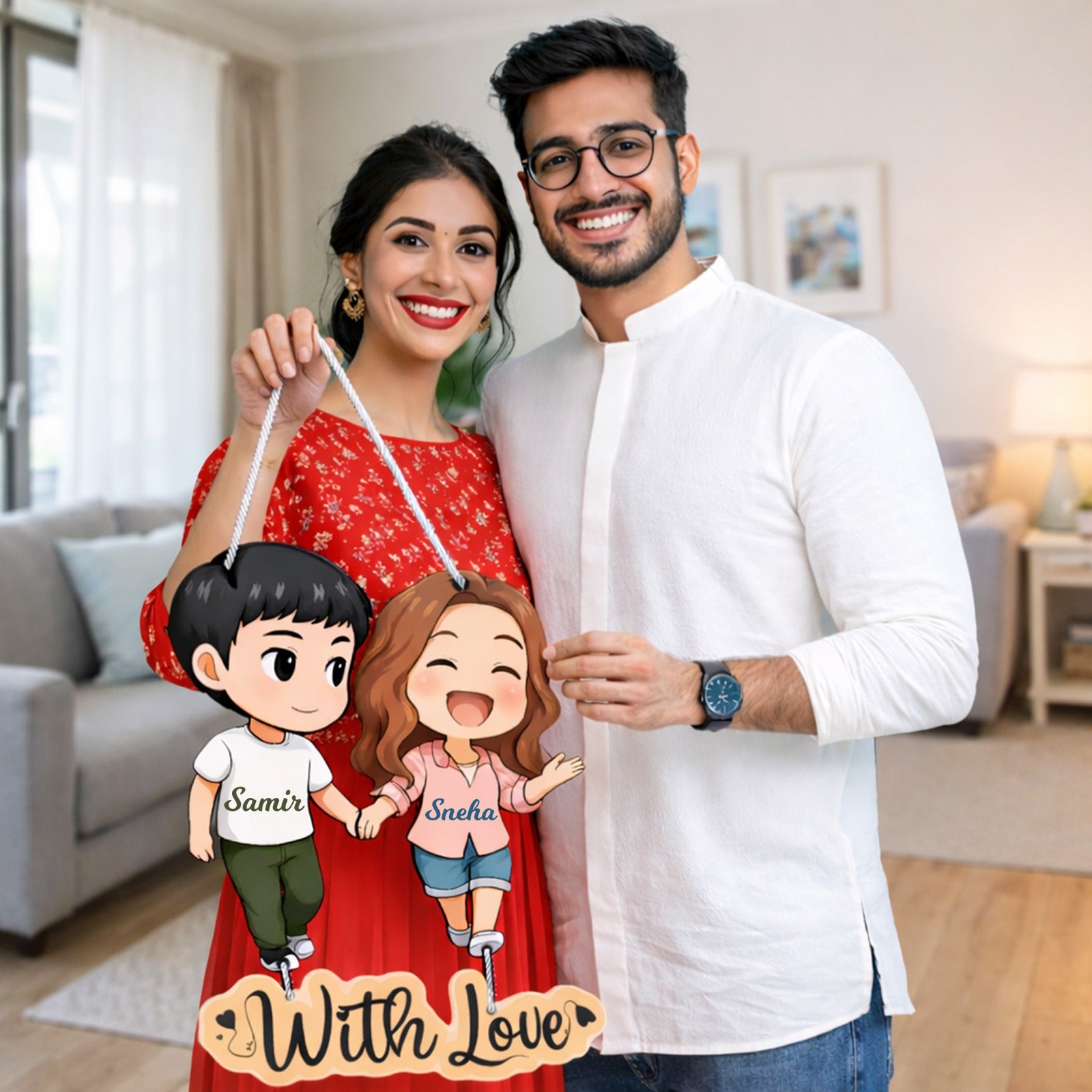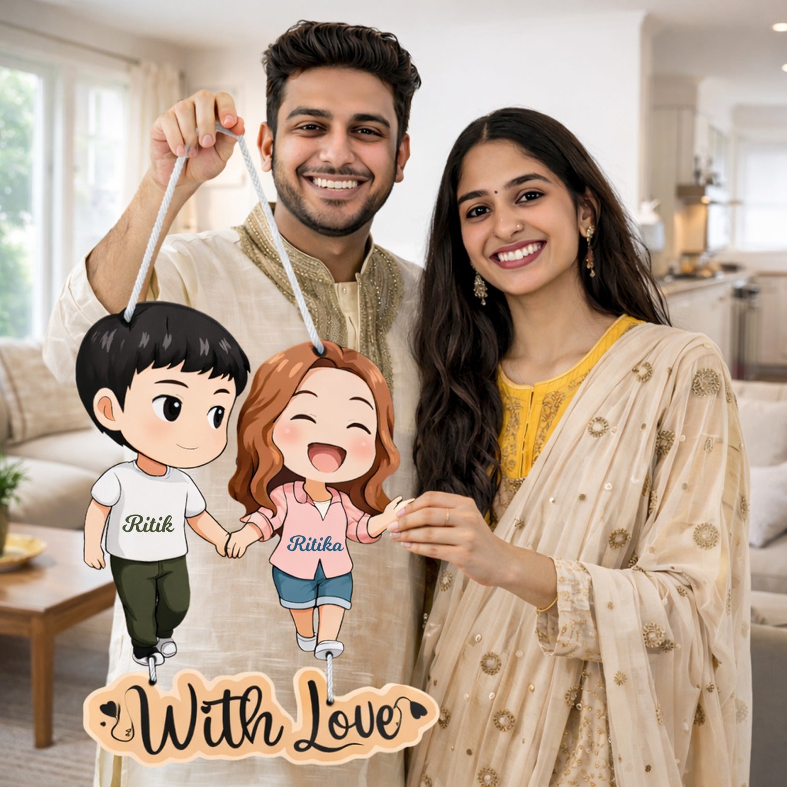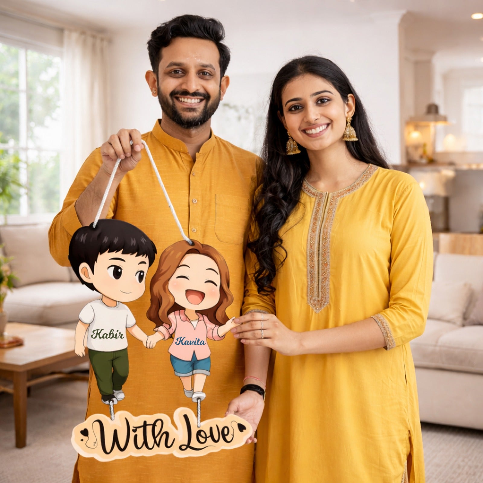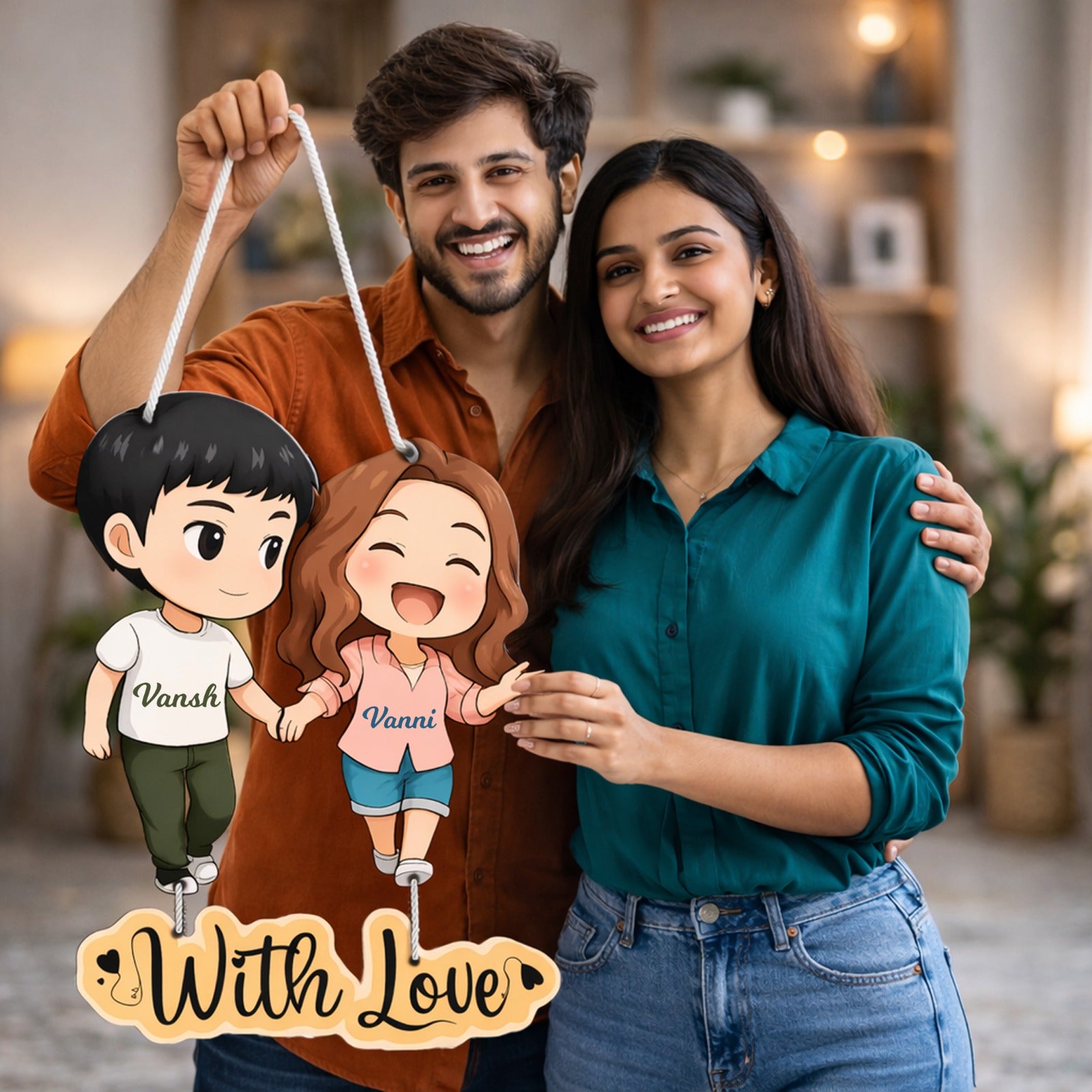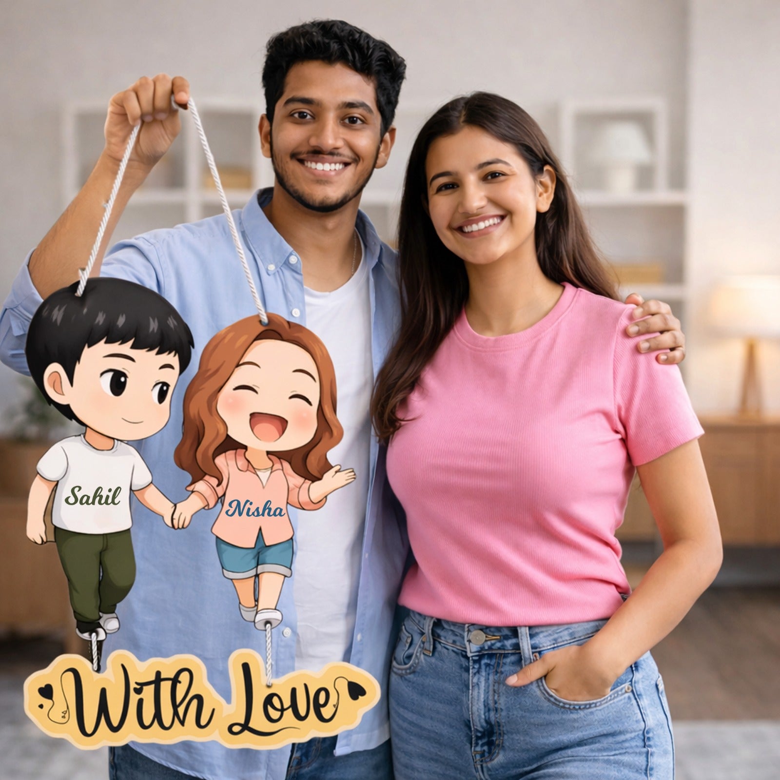- Custom Cartoon Couple Design – Your names printed on outfits for a cute, unique touch.