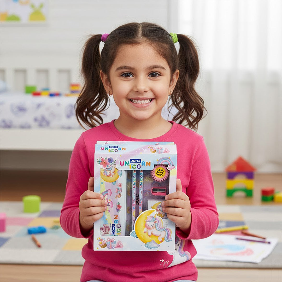 This cute unicorn-themed kids stationery set is customized with your child’s name and photo, making it a fun, practical, and memorable everyday school essential. Designed with bright colors and a magical unicorn theme, it’s perfect for young students.