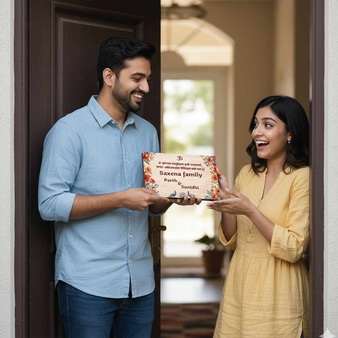 Buy a personalized family name plate (8×12 inch) with floral design and Sanskrit shloka. Perfect for home entrance & housewarming gifts by Love Craft Gifts.