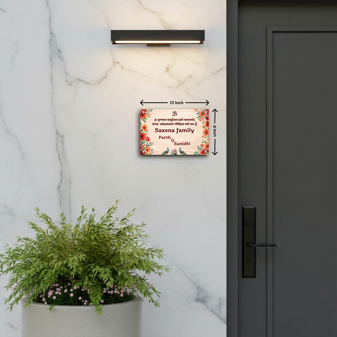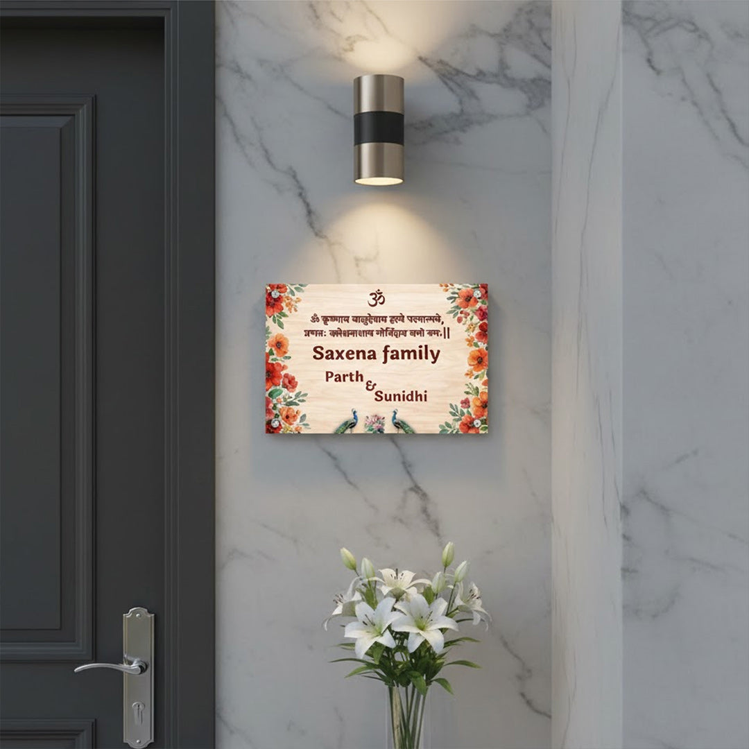 This beautifully crafted Personalized Family Name Plate features an elegant floral border, sacred Sanskrit shloka, and your family name printed with care—making your home entrance feel truly special and auspicious.