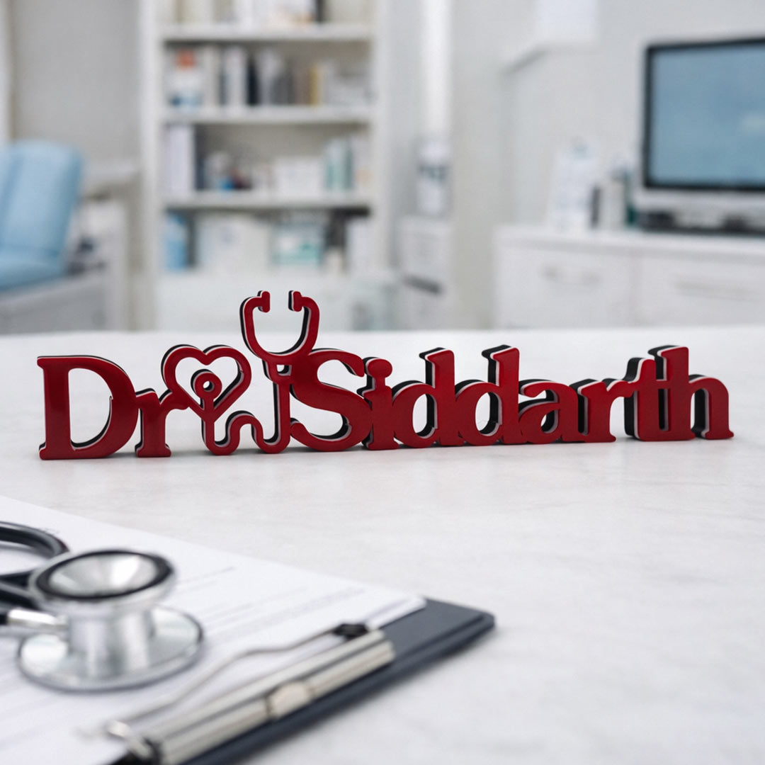 This Personalized Doctor Name Desk Decor is thoughtfully designed to transform a doctor’s name into an elegant statement piece. With its clean typography and premium finish, it adds a refined personal touch to clinics, hospital desks, home offices, and study spaces.