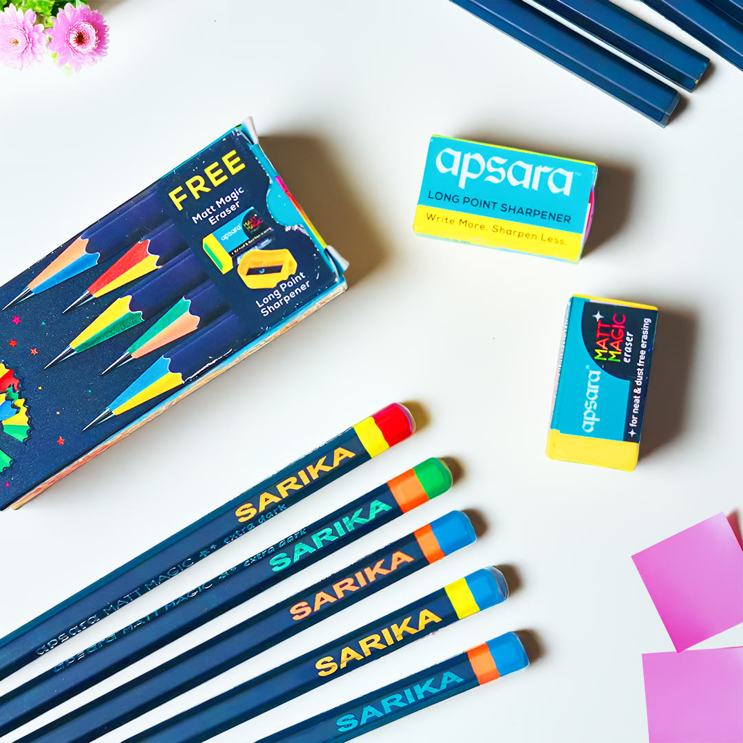 The Personalized Apsara Magic Pencil offers style, quality, and personalization in one package. With a sleek black design, vibrant inner colors, and custom name printing, these pencils make school supplies special and help kids keep track of their belongings. Trusted by parents for durability and smooth writing, Apsara delivers a fun and functional tool that kids love to use.