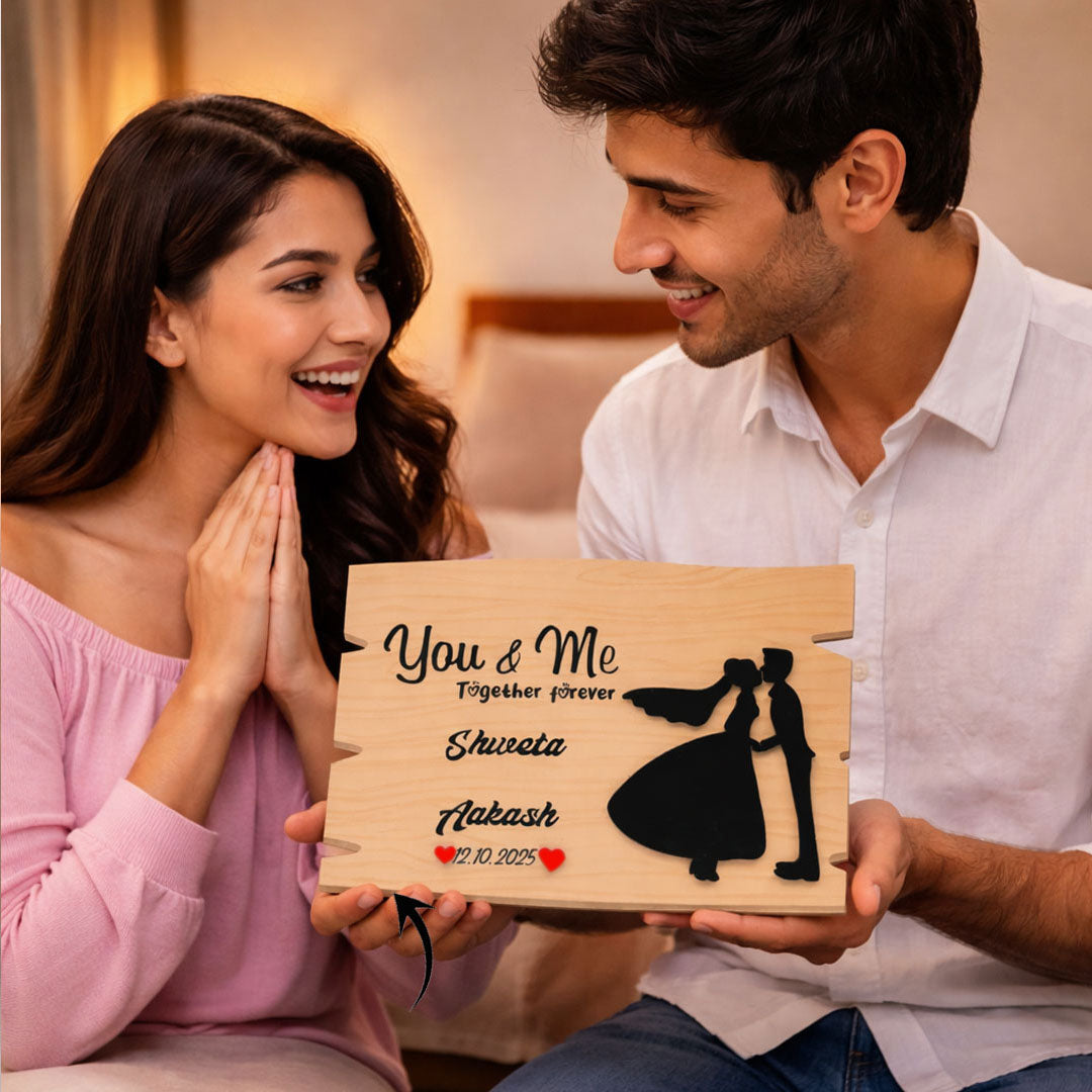 Celebrate love in its purest form with this beautifully crafted personalized wooden couple plaque. Designed with an elegant silhouette of a couple and engraved with custom names and a meaningful date, this piece transforms precious memories into lasting décor.